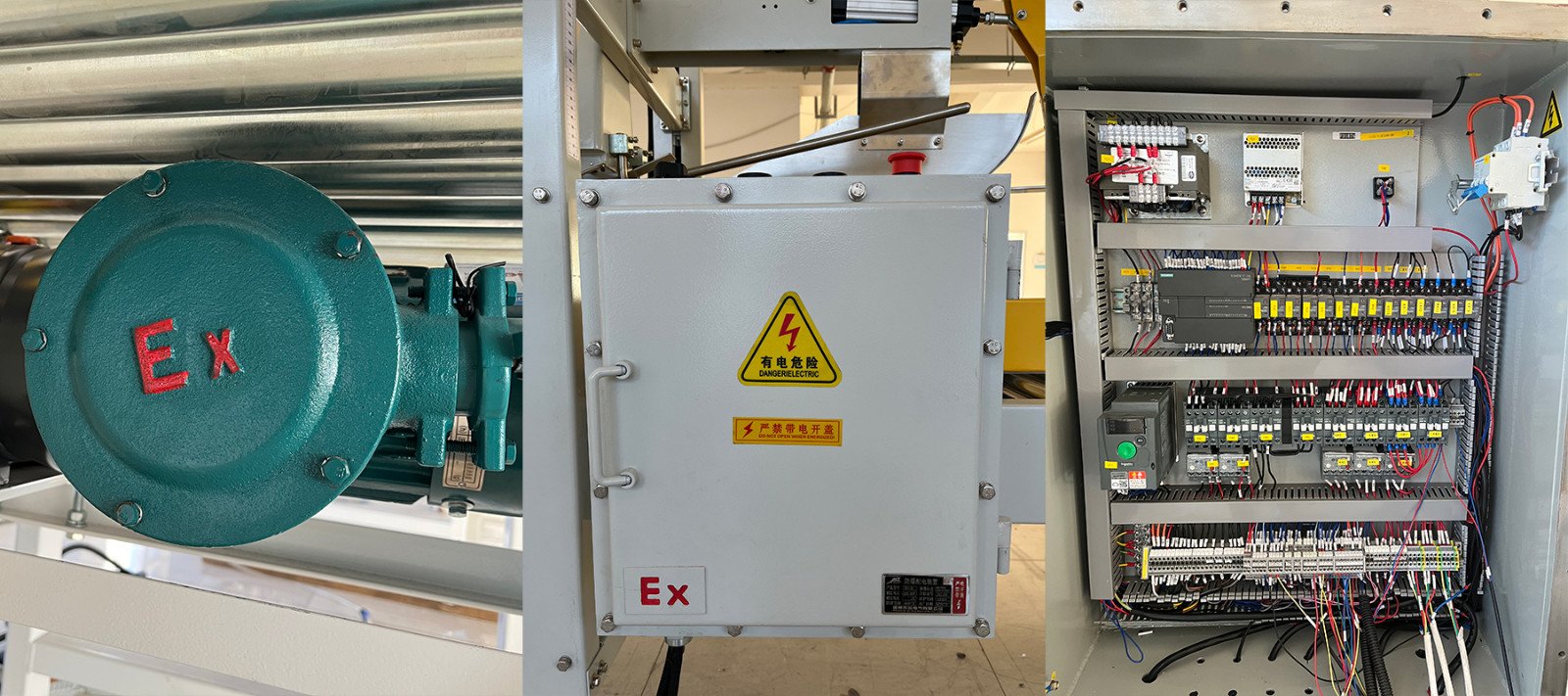 防爆包裝線是為了迎合國家安全生產的大方針應運而生的,主要應用于軍工、民爆、化工以及粉塵行業。該線體的最大特點是所有設備均為防爆型,而防爆型的標準為:電機、電箱和按鈕防爆,防爆等級為BT4級。