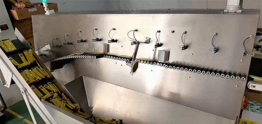無序理料機也叫自動理袋機,可在生產中單獨使用,也可以與裝盒機對接,完成無規則的堆積物料從集中到分散再到順序擺放的整個整理過程。它是將無規則堆積物料倒入儲料倉后,料倉輸送帶動作,將物料輸送至低速滾輪上。無序理料機通過低、中、高速滾輪的運轉,將物料逐一順序送出理袋機。 送出的物料根據包裝需要的形式或順序或堆疊進入裝盒機輸送當中完成下一工序的裝盒過程。