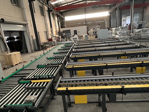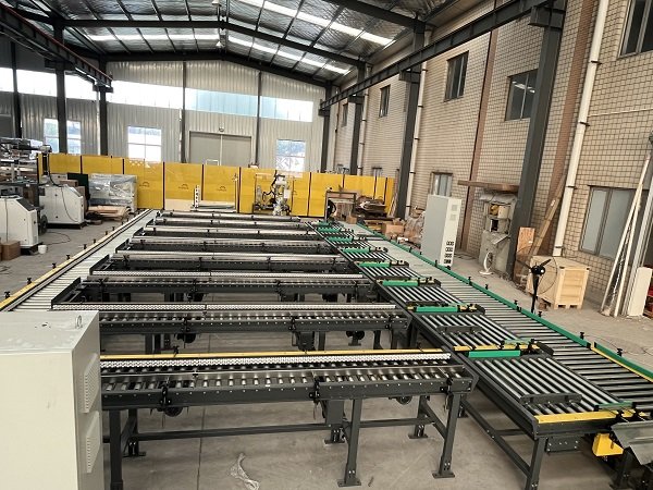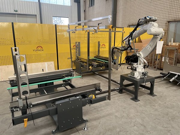 該線體主要功能是對卡丁車和賽車輪胎進行裝箱和碼垛。線體最大亮點是,客戶一共有8條產線4種紙箱尺寸同時混產,針對客戶的現實情況,艾訊采用了機器人+動力料倉+自適應折底封底機的結構,通過信號交互,來確定取哪款紙箱,開哪款紙箱,再通過信號識別,將紙箱輸送到指定的裝箱工位。同時該線體還配備了實時貼標加在線打印功能,通過和上位機的實時通訊,來確定紙箱需要打印的標簽內容。